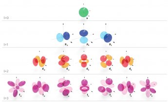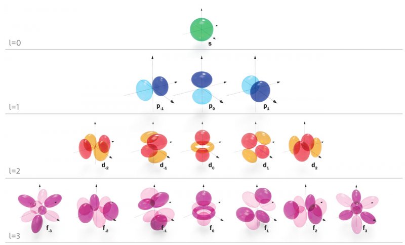 c.Rappresentazione spaziale degli orbitali atomici per valori di l da 0 (la sfera in alto) a 3 (le 7 configurazioni in basso). Ad ogni valore di l è associata una lettera (s,p,d,f). I valori di m che vanno da -l a +l sono indicati con un numero in pedice.