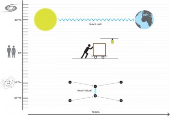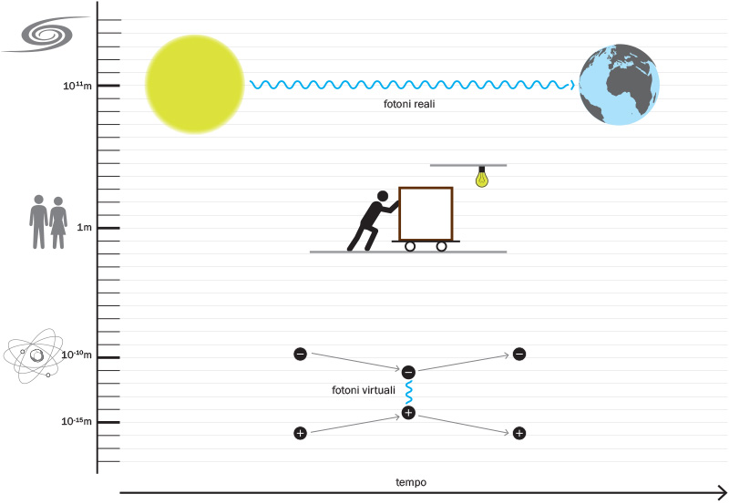 b. I messaggeri delle onde elettromagnetiche. Noi riceviamo la luce dal Sole e dalle altre stelle attraverso i fotoni reali, con un ritardo che dipende dalla distanza: nel viaggio dal Sole alla Terra la luce impiega otto minuti e mezzo, nel caso di galassie lontane il viaggio può durare miliardi di anni. L’interazione elettromagnetica tra particelle è mediata da fotoni virtuali, che vengono scambiati, in tempi brevissimi e su piccolissime distanze, tra le particelle cariche in interazione: questi processi sono rilevanti a scala subatomica. Alla scala delle dimensioni umane, i nostri sensi non percepiscono nessuno di questi effetti: la luce di una lampadina impiega qualche nanosecondo per raggiungere i nostri occhi e la trasmissione ci sembra istantanea, mentre il nostro tatto non è in grado di rivelare i fenomeni alla scala atomica, per cui le interazioni con gli oggetti che ci circondano ci appaiono come forze di contatto.