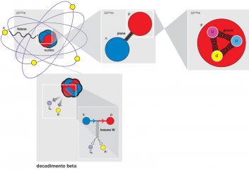c.Le interazioni elettromagnetiche, per esempio quelle che tengono insieme gli atomi, sono mediate dai fotoni. Il nucleo è invece tenuto insieme dall’interazione forte, che può essere rappresentata attraverso lo scambio di pioni, particelle dotate di massa, per cui l’interazione forte non può propagarsi a distanze superiori al raggio del nucleo. Il protone e il neutrone sono costituiti da quark: in questo caso l’interazione forte avviene tra le cariche di colore dei quark ed è mediata dai gluoni. L’interazione debole è invece responsabile dei decadimenti beta di alcuni nuclei, nei quali un neutrone si trasforma in un protone emettendo un elettrone e un antineutrino: l’interazione debole in questo caso è mediata da un bosone W (in altri casi da un bosone Z).