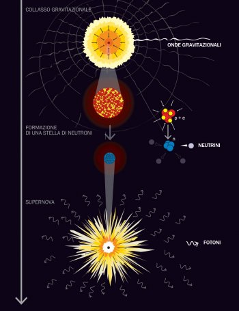 Un esempio di un possibile evento multimessaggero, rappresentato dall’evoluzione finale di una stella che ha esaurito i suoi processi di combustione: nella prima fase la stella subisce un collasso gravitazionale, emettendo onde gravitazionali; la contrazione del nucleo genera un plasma di protoni ed elettroni, che si possono fondere dando luogo a una stella di neutroni con emissione di neutrini; le parti più esterne della stella iniziale, costituite da elementi pesanti, “rimbalzano” e possono dar luogo a vari fenomeni, il più noto dei quali è la grande emissione luminosa che viene osservata dalla Terra come la comparsa di una supernova.