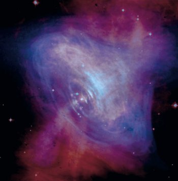 Immagine combinata nello spettro ottico e dei raggi X della Nebulosa del Granchio. I raggi X rivelano la presenza di una giovane pulsar, la PSR B0531+21.