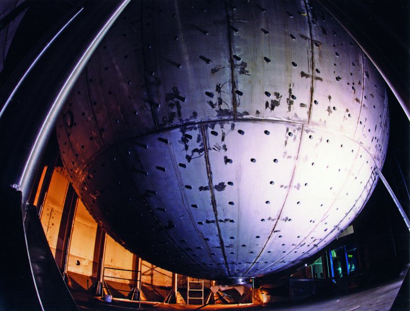 b.La struttura interna dell’esperimento Borexino, grazie al quale è stato possibile misurare i geoneutrini prodotti dall’uranio presente nella Terra.