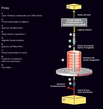 Il principio della misura è molto semplice e consiste nel far passare della luce polarizzata attraverso due prismi polarizzatori incrociati. Se lungo il suo percorso, che include anche una zona di campo magnetico, la polarizzazione della luce non subisce modifiche allora, all’uscita del secondo polarizzatore, ci sarà buio, altrimenti filtrerà una piccola quantità di luce contenente le informazioni sui processi fisici che hanno causato la variazione della polarizzazione stessa. La realizzazione pratica ha però comportato il superamento di sfide scientifiche e tecnologiche di non poco conto per l’estrema piccolezza degli effetti da rivelare. Si utilizza un magnete superconduttore lungo un metro immerso in un bagno di elio liquido in grado di generare un campo magnetico 100.000 volte più intenso di quello terreste. E ci si avvale anche di un particolare dispositivo, detto “risonatore ottico di Fabry-Pérot”, in grado di accumulare i fotoni all’interno del magnete anche per circa un millesimo di secondo (si pensi che un fotone libero impiegherebbe tre miliardesimi di secondo per attraversarlo). Ma ciò ancora non basta. Si immagini per esempio di osservare di notte le luci di una città e di voler individuare la fioca luce di una particolare piccola finestra accesa. Non c’è speranza di riuscirvi a meno che il proprietario della finestra, da noi preventivamente istruito, non accenda e spenga la luce a una certa frequenza concordata. Nel caso del nostro esperimento questa condizione si realizza ruotando fisicamente, con l’equivalente di un grosso giradischi, tutte e cinque le tonnellate di peso del magnete e del criostato che lo tiene nel suo bagno di elio liquido.