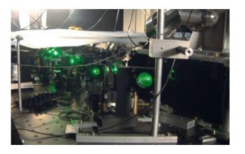 d. Vista del banco ottico inferiore di Pvlas con i componenti ottici attraversati da un fascio laser verde.