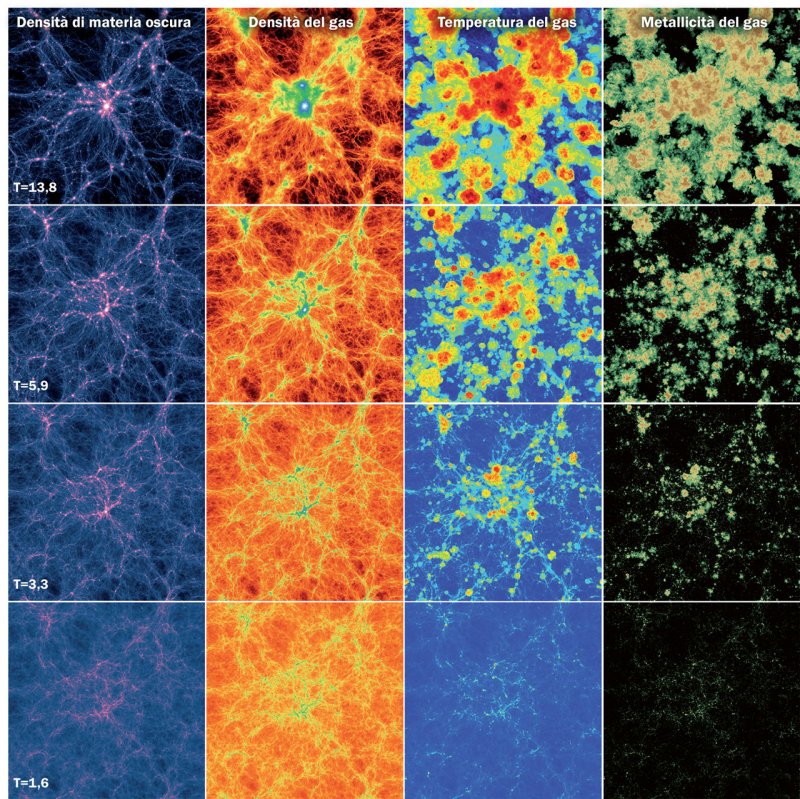 b.Simulazione dell’evoluzione nel tempo di una porzione di universo. Le quattro colonne mostrano, da sinistra a destra, la distribuzione di materia oscura, la distribuzione di gas, la temperatura del gas e l’abbondanza di elementi chimici più pesanti dell’idrogeno e dell’elio (metallicità). Il tempo (T) è indicato in miliardi di anni a partire dal Big Bang.