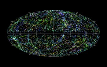 c. Mappa tridimensionale dell’universo. I puntini colorati rappresentano la posizione nel cielo di galassie osservate dalla survey 2Mass entro una distanza massima di circa 380 milioni di anni luce. I diversi colori codificano la distanza delle galassie da noi, dalle più vicine, viola, alle più lontane, rosse.