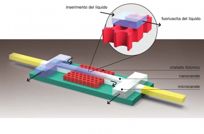 Un esempio del primo approccio si ha nella realizzazione di circuiti a cristalli fotonici (vd. p. 42), le cui caratteristiche fisiche, che ne determinano il funzionamento, possono essere modificate mediante l'integrazione di nanocanali riempiti con un liquido opportuno (vd. fig. b); oppure nella realizzazione di microrisonatori in guida d'onda ottica, strutture caratterizzate da una lunghezza d'onda di risonanza che può essere modificata cambiando il liquido presente in un sottile canale a contatto con il dispositivo stesso. Un esempio del secondo tipo si ha nei cosiddetti lab-on-a-chip, veri e propri laboratori biofotonici tascabili (letteralmente "laboratori su un chip"), nei quali l'integrazione di guide d'onda, assimilabili a circuiti di tipo ottico, consente di fare misure o di implementare funzionalità ottiche direttamente sul chip; oppure nella realizzazione di sensori ottici che consentono misure interferometriche su campioni contenuti in microcanali. In particolare, i lab-on-a-chip stanno assumendo un'importanza sempre crescente. Nascono come strutture microfluidiche per consentire l'analisi biochimica di piccole quantità di campioni fluidi, tipicamente di interesse biomedico (elettroforesi di sieroproteine, analisi del Dna). In generale, questo tipo di misure sono di tipo ottico (fluorescenza, assorbimento). Tradizionalmente, senza l'utilizzo dei lab-on-a-chip, queste misure vengono effettuate utilizzando un microscopio per illuminare il campione e raccogliere il segnale di misura, vanificando così la miniaturizzazione del contenitore del campione, ottenuta grazie alla microfluidica. L'integrazione di guide d'onda ottiche accoppiate con dei microcanali, come nei lab-on-a-chip, costituisce un significativo progresso in termini di compattezza, miniaturizzazione, riduzione dei costi, ma anche di facilità d'uso, in quanto elimina ogni problema di allineamento in fase di misura.