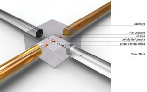 Schema di uno stretcher ottico (un dispositivo che deforma) per singole cellule. La sospensione contenente le cellule viene fatta fluire, mediante un gradiente di pressione, nel microcanale connesso a due capillari. La trappola ottica e la deformazione (stretching) vengono realizzati mediante i fasci "contropropaganti", in uscita dalle due guide d'onda, a loro volta accoppiate a due fibre ottiche.