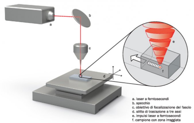 La realizzazione dei dispositivi "micro-optofluidici" in generale presenta alcuni aspetti critici. Da un lato l'integrazione di guide d'onda ottiche in piattaforme microfluidiche realizzate mediante tecniche litografiche tradizionali richiede una tecnica di fabbricazione delle guide stesse che ne consenta la realizzazione diretta alla stessa profondità del microcanale, senza indurre danni nel chip; dall'altro, nel caso di applicazioni più complesse, si rende necessaria la realizzazione di microcanali e guide d'onda in configurazione tridimensionale. Proprio l'aspetto tridimensionale rende complesso l'uso di tecniche tradizionali quali quelle litografiche che, essendo intrinsecamente planari, cioè con lavorazioni sulla superficie del campione, richiedono una fabbricazione multi-strato se si vuole ottenere strutture tridimensionali. Una tecnica di fabbricazione che si è rivelata ottimale per queste applicazioni è la scrittura diretta mediante impulsi laser a femtosecondi. Come illustrato in fig. 1, il fascio laser viene focalizzato all'interno del substrato in cui si intende fabbricare il dispositivo. Il substrato stesso viene poi traslato mediante posizionatori meccanici (chiamate slitte) di alta precisione nelle tre dimensioni spaziali, in modo tale che il fascio laser "scriva" la traccia della guida d'onda o del canale che si intende fabbricare. A seconda dei parametri del laser, e in particolare dell'intensità del fascio, nel substrato viene prodotta un'alterazione che può andare dalla semplice modificazione dell'indice di rifrazione (con conseguente realizzazione di una guida d'onda ottica) alla creazione di nanofratture; in quest'ultimo caso, facendo seguire all'irraggiamento un trattamento chimico per immersione del campione in un opportuno bagno acido (etching), si ha una rimozione selettiva di materiale nella zona irraggiata con conseguente realizzazione del microcanale. È quindi possibile utilizzare un laser a femtosecondi come una "penna" per scrivere direttamente entrambi i componenti base dei dispositivi micro-optofluidici.