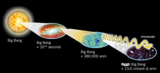 La figura ricostruisce le principali tappe della formazione del fondo cosmico a microonde. A causa dell’espansione successiva al Big Bang, l’Universo iniziò a raffreddarsi fino a raggiungere, 380.000 anni dopo, una temperatura così bassa da consentire la combinazione di nuclei ed elettroni in atomi. A questo punto la lunghezza d’onda tipica dei fotoni si aggirava intorno al micron (millesimo di millimetro), si trattava dunque di fotoni “micrometrici” (mentre le microonde hanno lunghezze d’onda millimetriche). Da qui in poi i fotoni presero a muoversi liberamente sotto l’azione della sola spinta espansiva dell’Universo, diminuendo la loro energia ovvero aumentando proporzionalmente la loro lunghezza d’onda. Oggi, dopo che l’Universo ha aumentato di un fattore 1000 le sue dimensioni, la lunghezza d’onda di questi fotoni risulta essere dell’ordine del millimetro e sono quindi rivelati dai nostri telescopi come flebili microonde, ma si tratta esattamente degli stessi fotoni presenti nel periodo di formazione degli atomi. [C. P.] |