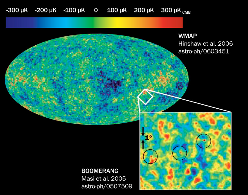 d. Mappe del fondo cosmico a microonde “fotografate” da Boomerang e Wmap. È l’immagine più antica che possiamo ottenere dell’Universo primordiale. Il contrasto dell’immagine è stato aumentato decine di migliaia di volte per rendere visibili le tenui strutture. Nelle immagini si vede come la materia “normale” sta iniziando a concentrarsi su preesistenti strutture di materia oscura. Solo grazie a questo processo è stato possibile, nei successivi miliardi di anni, che si formassero le strutture visibili nell’Universo di oggi: galassie, ammassi di galassie, stelle e noi stessi.