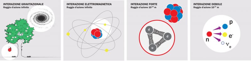 Da che cosa dipende la grande differenza tra le quattro forze che conosciamo, elettromagnetica, debole, forte e gravitazionale? Per quanto sorprendente, è solo nel contesto della fisica delle particelle che tali differenze diventano semplici da spiegare. Grazie a tale semplicità, è stato possibile organizzare in forma unificata forze all’apparenza molto diverse. Le particelle elementari interagiscono tra loro secondo regole decodificate nell’ultimo secolo e tali interazioni danno luogo a quelle che chiamiamo forze. Alcune particelle dette bosoni sono responsabili della generazione di forze. Lo scambio di un bosone tra due particelle genera infatti una forza, intesa come la tendenza del sistema a minimizzare l’energia. Per questo motivo i bosoni vengono definiti “mediatori”. Se pensiamo alle interazioni come mediate dallo scambio di particelle, non ci sorprende che le caratteristiche delle forze derivino direttamente dalle proprietà dei mediatori. Ad esempio, il raggio di interazione (range), una delle proprietà delle forze, è principalmente legato alla massa del mediatore. Più questo è leggero, più il range è grande, in accordo con l’interpretazione quantistica che associa a ogni particella una lunghezza d’onda inversamente proporzionale alla sua massa. Le uniche forze a lungo raggio sono la forza elettromagnetica e quella gravitazionale, corrispondenti a mediatori senza massa, fotone e gravitone (questo secondo non è ancora stato osservato sperimentalmente). La forza debole invece, responsabile dei fenomeni di radioattività naturale, è associata ai bosoni W e Z. Queste particelle sono pesanti e dunque la forza debole è attiva solo su scale subatomiche (dell’ordine di 10-16 cm). Le interazioni sono caratterizzate da un’altra quantità, detta “accoppiamento”, che determina l’intensità dell’interazione stessa e, in generale, dipende dall’energia del processo in questione. Questo nuovo ingrediente spiega l’apparente paradosso della forza forte, responsabile della stabilità dei nuclei. Sappiamo che essa è mediata da particelle senza massa, i gluoni, che si accoppiano ai quark, cioè ai costituenti di protoni e neutroni. Tuttavia, essa non ha effetti a lungo raggio perché l’accoppiamento aumenta con la distanza, come se i quark fossero legati da una molla. Non vediamo quark e gluoni liberi su distanze più grandi di 10-14 cm, bensì protoni e neutroni, entrambi costituiti da tre quark confinati.