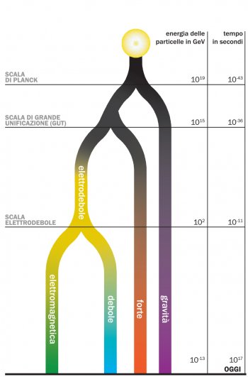 Ci sono inoltre ulteriori motivazioni teoriche che privilegiano questo scenario, dettate dalla possibilità di risolvere il mistero dell’asimmetria materia-antimateria nell’universo (vd. Lo specchio rotto, ndr). Possiamo spingerci oltre l’unificazione elettro-debole? Abbiamo già detto che ad alte energie, cioè a piccole distanze, tutte le particelle del modello standard possono essere considerate prive di massa. In questo limite le forze diventano dunque tutte a lungo raggio, inclusa la forza forte, con il caveat che la dipendenza dall’energia dei tre accoppiamenti fondamentali (tralasciando la gravità) in generale è diverso.