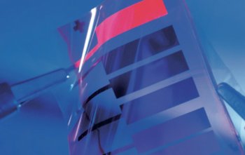 Immagine di un dispositivo di tipo "plastic fantastic" sospeso tra due elettrodi. I materiali plastic fantastic hanno le stesse proprietà di conduzione elettrica di semiconduttori come il silicio, ma sono caratterizzati da proprietà meccaniche tipiche della plastica. Questo li rende molto più flessibili all'impiego in contesti e per obiettivi diversi, dall'illuminazione domestica ai dispositivi tv, schermi e smartphone. Nella figura parte del dispositivo si illumina di colore rosso al passaggio della corrente.