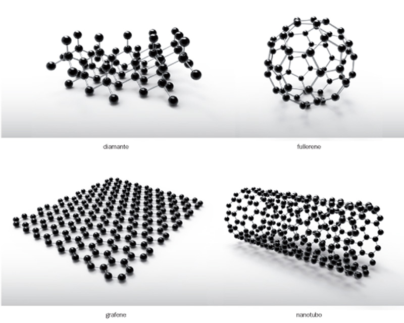 Le forme allotropiche del carbonio: il diamante, il fullerene, la grafite (è raffigurato un solo strato, ossia il grafene) e la struttura a nanotubo.
