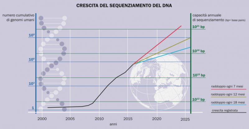 a.Nella figura è riportata la crescita della quantità di informazioni disponibili per i ricercatori (misurata in numero di genomi umani) al passare del tempo. Come si può vedere stiamo assistendo a una crescita esponenziale (l’asse delle ordinate è in scala logaritmica, in questa scala una crescita esponenziale corrisponde a una retta), ma la cosa impressionante è la rapidità di questa crescita. La cosiddetta “legge di Moore”, che ha governato la crescita della potenza di calcolo dei computer negli ultimi anni, prevede un raddoppio ogni 18 mesi (la retta blu). In ambito genomico abbiamo assistito negli ultimi 10 anni a un raddoppio ogni 7 mesi! Estrapolando questa curva (la retta in rosso nella figura) arriveremo tra un paio di anni ad avere una quantità di dati a disposizione dei ricercatori dell’ordine dello yottabyte (1024 byte, un milione di miliardi di miliardi di byte), paragonabile all’intera capacità di memoria disponibile sul pianeta oggi.