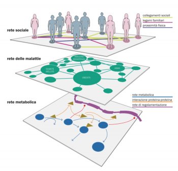 c. Alla base della medicina di precisione è l’idea di integrare diverse fonti di informazione molecolare (nella figura sono rappresentate dal livello più basso: ogni nodo potrà essere un gene o una proteina o un metabolita) associandole alle possibili patologie (nella figura è il livello intermedio, ogni nodo rappresenta una malattia diversa) e associare queste informazioni alle caratteristiche peculiari dei singoli individui (rappresentati nella figura dal livello più alto, in cui ogni singolo individuo è caratterizzato non solo dalla sua particolare sequenza di Dna e dalla sua particolare rete di regolazione genica, ma anche dalle sue interazioni con gli altri individui e con l’ambiente).