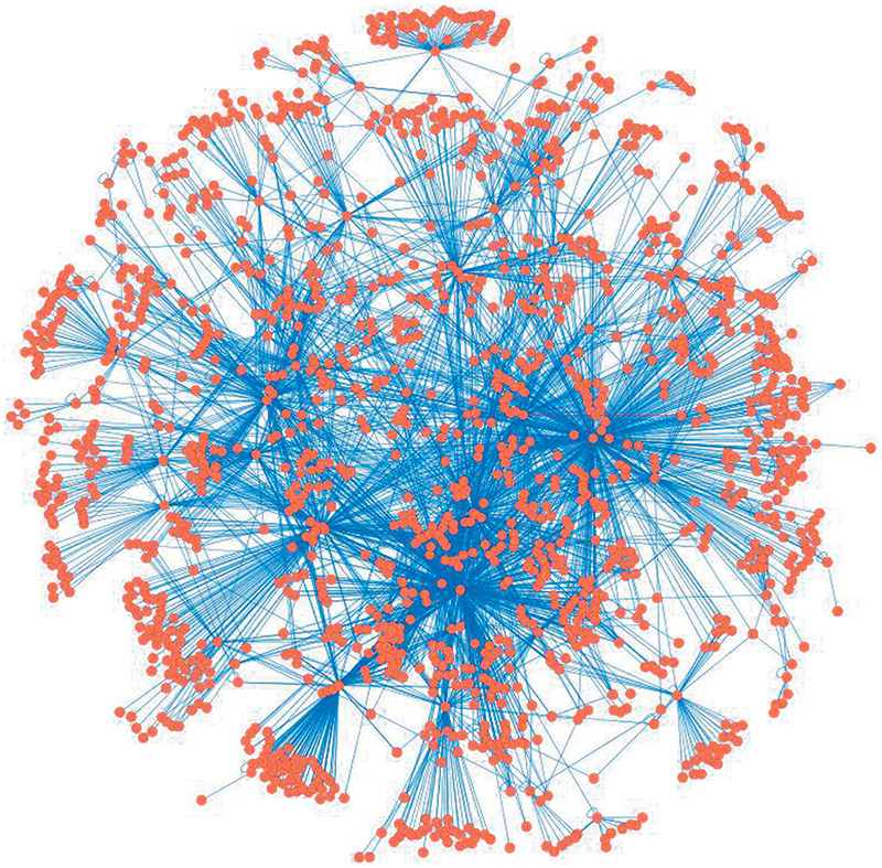 b.La rete di regolazione dell’Escherichia coli, un piccolo batterio che vive abitualmente nel nostro intestino e che è uno dei più studiati organismi modello in biologia molecolare. Nella figura ogni nodo rappresenta una proteina e le interazioni con cui una proteina regola l’espressione di un’altra proteina sono indicate da linee blu.