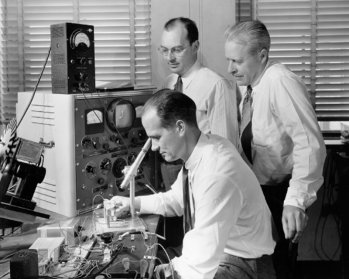 Shockley, Bardeen e Brattain (da sinistra a destra), premi Nobel per la fisica nel 1956 per la scoperta del transistor bipolare.
