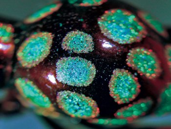 Sono "cristalli", perché formati da una struttura periodica, che si ripete, e sono "fotonici", perché agiscono sui fotoni. Così come il potenziale elettrico periodico presente nei cristalli atomici agisce sugli elettroni generando le bande di energia (come quelle presenti nel silicio), una struttura in cui viene modulato artificialmente l'indice di rifrazione (la grandezza che indica quanto un mezzo modifica la velocità della luce che lo attraversa) agirà sui fotoni, creando delle vere e proprie bande energetiche fotoniche con delle gap, cioè delle regioni di energia (e quindi di frequenza) proibite. I fotoni con una frequenza all'interno della gap non si potranno propagare nel cristallo fotonico e verranno pertanto totalmente riflessi, determinando così la percezione del colore dell'oggetto. I cristalli fotonici artificiali sono nati a partire dai lavori pionieristici di E. Yablonovitch e J. Joannopoulos negli anni '90 e si sono sviluppati grazie alla capacità di controllare la materia attraverso le nanotecnologie. Un semplice esempio di cristallo fotonico bidimensionale è rappresentato da un'alternanza di fori nanometrici, disposti in forma regolare su una sottile lamina di un materiale semiconduttore (come per esempio il silicio). All'interno del foro l'indice di rifrazione relativo del mezzo è pari a uno (quello dell'aria), mentre nel resto della lamina è quello del materiale. Si ha così una modulazione periodica dell'indice di rifrazione che agisce sulle energie permesse ai fotoni. Se ora realizziamo artificialmente un "difetto" nanometrico all'interno della struttura periodica (in fig. d l'assenza di tre fori), cioè una regione in cui la periodicità è interrotta, in questa regione (e solo in questa regione) i fotoni di frequenza "proibita" potranno esistere, ma resteranno lì confinati non potendosi propagare nelle regioni limitrofe. Questo "difetto" rappresenta una nanocavità fotonica. L'inserimento di un materiale attivo otticamente (che quindi emette fotoni) dentro la nanocavità produrrà il confinamento dei fotoni emessi ed eventualmente, in alcuni casi, un'azione simile a quella di un laser. Ci troviamo di fronte a un nanolaser (vd. fig. d). I nanolaser al silicio non sono stati ancora realizzati, ma la ricerca punta oggi a progettare e realizzare nanocavità fotoniche sempre migliori e ad accoppiarle opportunamente a sistemi otticamente attivi in grado di produrre guadagno ottico. Ci auguriamo che gli sforzi della comunità scientifica internazionale possano in un prossimo futuro portare alla realizzazione di un nanolaser al silicio a pompaggio elettrico, producendo così una rivoluzione scientifico-tecnologica con implicazioni enormi e ancora non del tutto immaginabili.