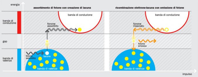 Visualizzazione della transizione di un elettrone dalla banda di valenza alla banda di conduzione (assorbimento di fotoni) e di ricombinazione elettrone-lacuna con emissione di fotoni.