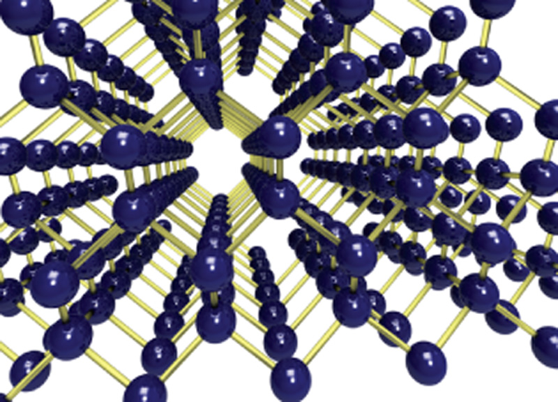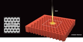 Visualizzazione schematica di un nanolaser a cristallo fotonico. Nell'immagine a sinistra è ben visibile la nanocavità fotonica (l'assenza di tre fori).
