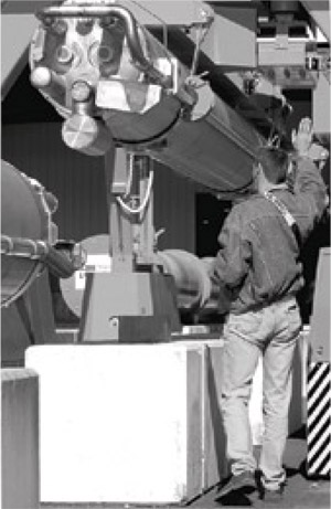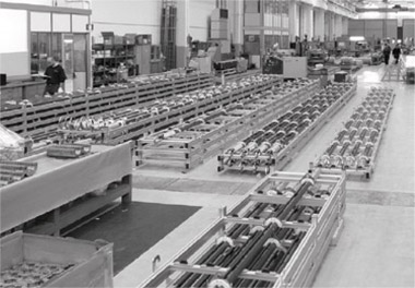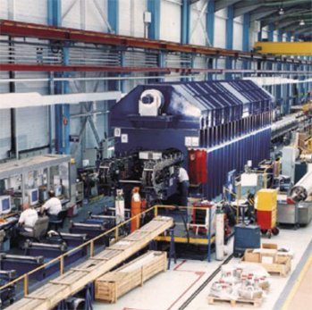 d. Produzione dei dipoli magnetici in industria: fase di chiusura del recipiente a elio nella stazione di saldatura dei dipoli. La saldatura è completamente automatica: è effettuata sotto pressa (struttura blu) e guidata da tecnici saldatori (a sinistra, ai loro computer) tramite software di gestione.