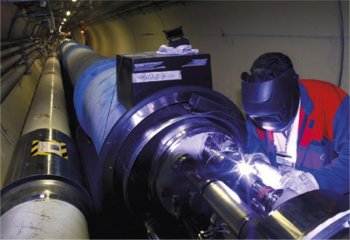 e. Operazioni nel tunnel di Lhc: chiusura con saldatura delle interconnessioni tra due dipoli (cilindro blu). A sinistra è visibile la linea di distribuzione criogenica (cilindri bianchi) che corre lungo i 27 km a fianco dai magneti.