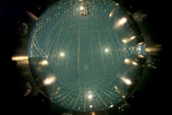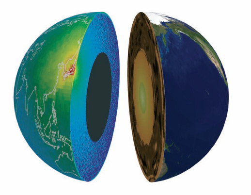 L’esperimento giapponese Kamland studia le proprietà dei neutrini, osservando l’intenso flusso di queste particelle (visualizzato nella figura di sinistra) proveniente dalle centrali nucleari vicine (in rosso nella figura). Kamland ha anche permesso di identificare per la prima volta il debole flusso di geoneutrini (in azzurro), prodotti prevalentemente dai decadimenti dell’uranio e del torio all’interno della Terra.