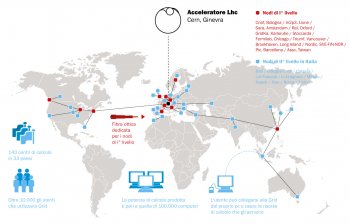 Per questo sarà necessaria l’analisi dei 15 milioni di gigabyte di dati, prodotti ogni anno da Lhc, pari a una torre di cd alta 20 chilometri, ovvero come 60 torri Eiffel una sull’altra.La gestione e l’analisi di questa immensa mole di dati avverrà attraverso le migliaia di nodi di calcolo della Lhc-Grid sparsi su tutto il pianeta e organizzati in diversi livelli. Gli undici del primo “livello” (Tier 1), tra cui il Cnaf (il centro per la ricerca e lo sviluppo delle tecnologie informatiche dell’Infn) di Bologna, riceveranno direttamente dal Cern i dati prodotti dall’acceleratore, per elaborarli, analizzarli, archiviarli e smistarli successivamente agli altri centri sul pianeta. La Grid di Lhc a oggi è l’unica ad avere un’estensione mondiale, con siti nei diversi continenti, anche se non è l’unica griglia di condivisione delle risorse di calcolo e memoria.