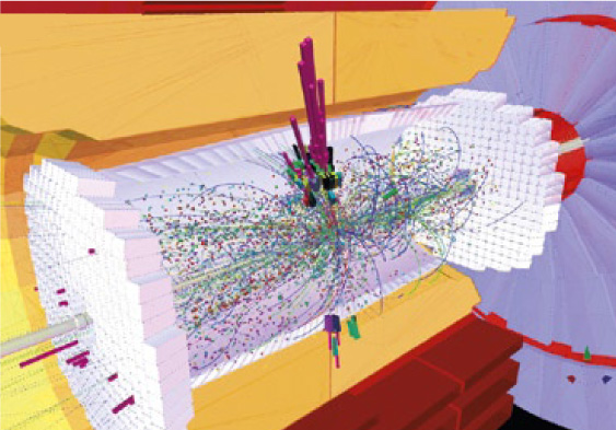 c. La simulazione di uno dei milioni di eventi che saranno prodotti in Lhc: i prodotti di una collisione tra frasci di protoni registrati nel rivelatore Cms.