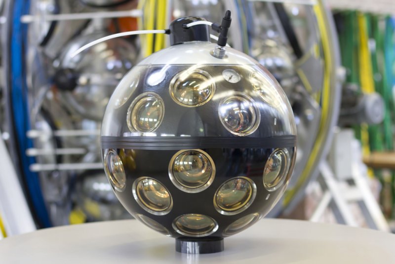 c. Un modulo di rivelazione dell’esperimento Km3net/ Arca, in costruzione al largo di Capo Passero, in Sicilia, a 3500 metri di profondità.