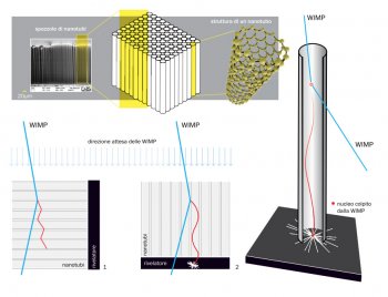 c.Schematizzazione dell’utilizzo dei nanotubi per identificare la direzione di provenienza delle Wimp. Nel box grigio a sinistra è visualizzata una foto micrometrica di una spazzola di nanotubi, al centro la rappresentazione schematica dei nanotubi e a destra la struttura atomica di uno di essi. In basso a sinistra, lo schema di una sezione di spazzole di nanotubi:
