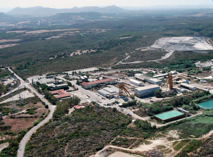 b.Vista dall’alto della miniera di Monte Sinni, nel bacino carbonifero del Sulcis, in Sardegna, dove si sta progettando una torre di distillazione alta come la torre Eiffel che permetterà di separare l’aria nei suoi componenti fondamentali (da cui il nome del progetto, Aria). Uno di questi componenti, l’argon-40, senza le contaminazioni dell’isotopo instabile argon-39, permetterà lo sviluppo dell’esperimento Dark Side nei Laboratori del Gran Sasso.