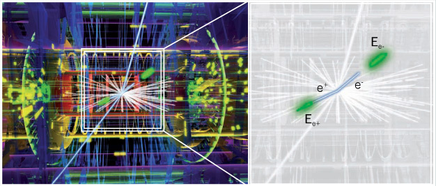 A sinistra, rappresentazione di un evento, in cui il bosone Z decade in una coppia elettrone-antielettrone, visto dal rivelatore Atlas. Tra i tanti segnali visibili sono ben riconoscibili, a destra, quelli lasciati da ciascun elettrone: la traccia (in azzurro), da cui si può misurare l’impulso pe, seguita dal segnale (in verde) lasciato nel calorimetro elettromagnetico, da cui si può misurare l’energia Ee. Dalla conservazione di energia e impulso si misura la massa dello Z: (mZc²)²=EZ ²-(pZc)², dove pZ=pe¹+pe² e EZ=Ee¹+Ee². |