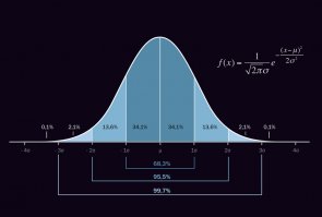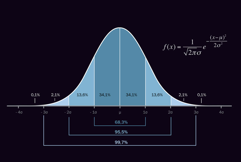 La figura riproduce la distribuzione di Gauss (o “gaussiana”), detta anche distribuzione normale degli errori, perché rappresenta la distribuzione di probabilità tipica degli errori di misura. La distribuzione è simmetrica rispetto al parametro μ, che ne rappresenta il valor medio (e può essere considerato il “valore vero” della quantità da misurare) e ha una caratteristica forma a campana, la cui larghezza dipende da un secondo parametro, σ, che prende il nome di “deviazione standard” e che dà una stima dell’errore tipico di una misura. La probabilità che una singola misura cada in un certo intervallo dell’asse delle x è data dall’area sottesa dalla curva in quel dato intervallo. In figura sono rappresentate le probabilità che una misura cada negli intervalli compresi tra μ e μ+σ, tra μ+σ e μ+2σ, e così via fino a 4σ. Poiché la curva è simmetrica, la probabilità che una misura cada in un intervallo di ±σ, ± 2σ, ± 3σ ecc. intorno a μ è del 68,3%, 95,5%, 99,7% ecc. La probabilità che una misura cada a destra di 5σ, considerato il limite convenzionale di una scoperta, è di una parte su 3,5 milioni. [Egidio Longo]