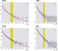 b.Nei dati del 2015 (i due grafici di sopra), sia in Atlas che in Cms c’era un eccesso di eventi inatteso nella regione segnata in giallo. Tale eccesso di eventi è sparito in entrambi gli esperimenti nei dati del 2016 (in basso).
