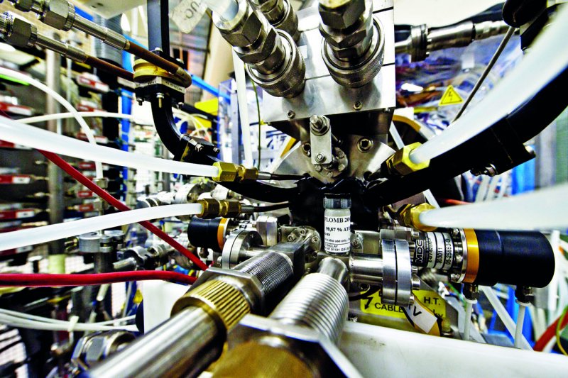 b.La boccetta in foto contiene la sorgente di isotopi di piombo 208 puri al 99,57%, che vengono poi vaporizzati nel forno prima di essere iniettati nel Linac3 del Cern. Intorno si possono osservare tubi di raffreddamento, cavi e strumenti di misura.