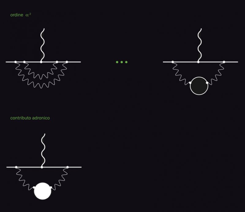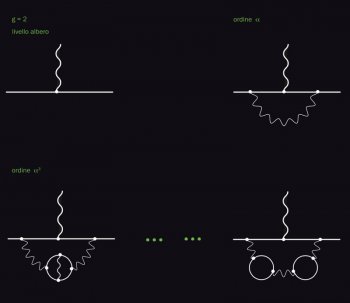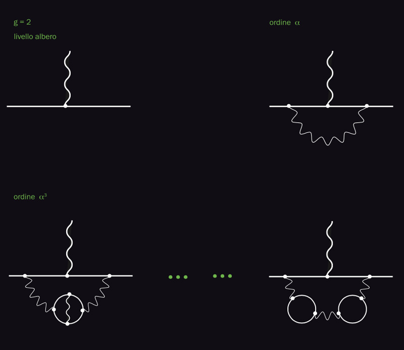 1. I contributi a ordini crescenti in loop al momento magnetico di elettrone o muone sono rappresentati dai diagrammi di Feynman in figura. Il primo diagramma rappresenta il contributo a “livello albero” (zero loop) che dà il valore corrispondente all’equazione di Dirac g=2. Il secondo rappresenta il contributo a un loop, calcolato da Schwinger nel 1948 che dà un contributo ad a proporzionale ad α, precisamente pari a α/(2 π). Sono poi rappresentati solo alcuni dei molti diagrammi a due e tre loop che danno rispettivamente contributi proporzionali a α2 e α3. L’ultimo diagramma rappresenta il contributo di polarizzazione del vuoto dove la “bolla” piena rappresenta il contributo di tutti i possibili adroni. Le gambe esterne, uguali per tutti i diagrammi, rappresentano l’elettrone o il muone (linee continue) e il fotone (linea ondulata).