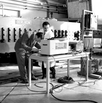 b.Il primo esperimento “g-2” nel sincrociclotrone del Cern negli anni ’60, in cui erano all'opera Farley (a sinistra) e Zichichi (a destra).