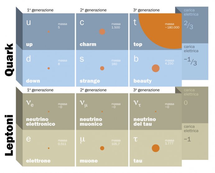 Le particelle elementari, quark e leptoni, sono suddivise in base alla loro massa in tre famiglie o generazioni, in ordine di massa crescente (qui espressa in MeV/c2). Nel caso dei leptoni, i neutrini sono elettricamente neutri e hanno massa molto piccola, dell'ordine di una frazione di eV/c2. Un'analoga tabella contiene le antiparticelle, che si indicano con una linea sopra al loro simbolo.