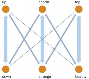 Tabella delle possibili transizioni tra quark di tipo diverso. Esse sono mediate dal bosone W e permettono di collegare generazioni diverse. Le transizioni più probabili sono sempre quelle all'interno della stessa generazione (frecce verticali). Le relazioni matematiche tra le forze associate a ognuna di esse costituiscono il meccanismo di Cabibbo, Kobayashi e Maskawa. Nella figura, le linee con uno spessore maggiore rappresentano le transizioni più probabili.