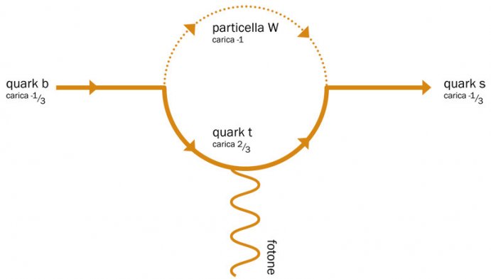Il mescolamento dei quark avviene sempre attraverso lo scambio del bosone carico W. Nella figura è rappresentato il diagramma di Feynman del decadimento di un quark beauty in un quark strange e un fotone. I decadimenti di un quark in un altro quark di carica uguale, come il caso rappresentato, sono possibili solo facendo agire due volte il W sui quark. I fenomeni di questo tipo sono chiamati Fcnc (Flavor Changing Neutral Currents) e sono molto rari.