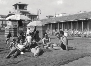 a.Da destra verso sinistra: Enrico Fermi, Giancarlo Wick e Edoardo Amaldi, con le rispettive famiglie a Ostia nel 1936.