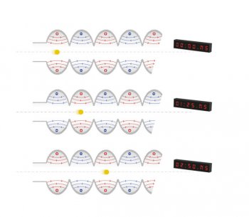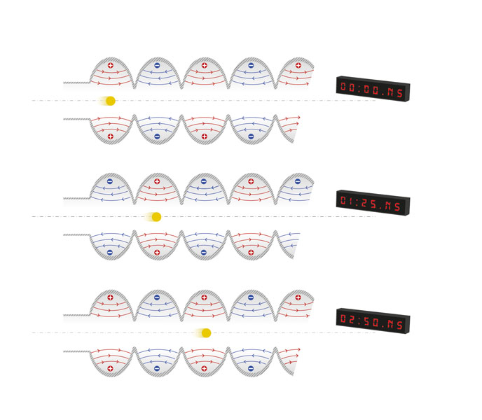 b.Schema di funzionamento delle cavità risonanti a radiofrequenza a Lhc. I pacchetti che si muovono all’interno dell’acceleratore perdono energia, che viene restituita nel passaggio attraverso le cavità risonanti. In Lhc le cavità funzionano a 400 MHz, cioè in ogni cavità il campo elettrico si modifica in modo continuo tornando ad avere lo stesso valore ogni 2,5 ns (quindi dopo 1,25 ns avrà la polarità opposta a quella che aveva al tempo 0), in fase con il passaggio dei pacchetti in modo che questi sentano sempre un campo accelerante.
