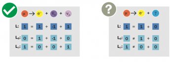 b.Se ci fosse un solo numero leptonico L, comune a elettroni e muoni, posto convenzionalmente uguale a 1 per le particelle (leptoni negativi e neutrini) e -1 per le antiparticelle (leptoni positivi e antineutrini), questo numero sarebbe conservato nel decadimento a sinistra, che rappresenta il decadimento del muone in elettrone, neutrino e antineutrino, che è quello che si osserva sperimentalmente, ma anche in quello di destra, in elettrone e fotone, che non è mai stato osservato. Se introduciamo invece due numeri leptonici distinti per famiglie o sapori (ovvero Le per gli elettroni e i loro neutrini e Lμ; per i muoni e i loro neutrini), assegnando, per ciascun sapore, di nuovo +1 alle particelle e -1 alle antiparticelle, ma 0 alle particelle o antiparticelle dell’altro sapore, il decadimento di sinistra conserva entrambi questi numeri, mentre in quello di destra né Le né Lμ; sono conservati. Si noti che la somma dei singoli termini di Le e Lμ; fa L.