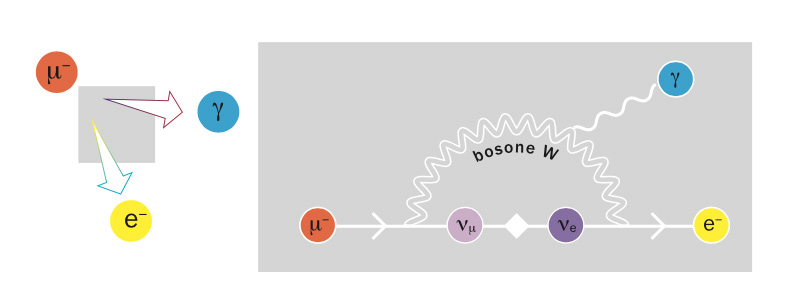 c.Diagramma che mostra come sia teoricamente possibile che un muone decada in elettrone e fotone attraverso l’oscillazione (vale a dire il cambiamento di sapore) dei neutrini: il muone si trasforma in un bosone W e un neutrino muonico, entrambi virtuali; il neutrino muonico oscilla in un neutrino elettronico; nel frattempo il bosone emette un fotone ed è riassorbito dal neutrino elettronico, trasformandolo in un elettrone.