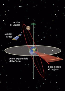 a. Rappresentazione idealizzata dell’effetto Lense-Thirring, come trascinamento della linea nodale dell’orbita di un satellite. L’effetto viene misurato usando i due satelliti Lageos ed i precisissimi modelli del potenziale gravitazionale della Terra forniti dalla coppia di satelliti gemelli Grace.