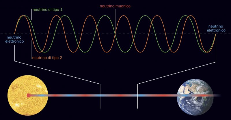 1.L’oscillazione dei neutrini solari, dalla loro origine fino alla Terra. Un neutrino elettronico prodotto nel Sole può essere rivelato come neutrino muonico sulla Terra.
