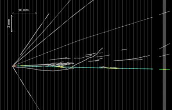 c. La prima interazione di neutrino tau trovata, nel 2010, dall’esperimento Opera. Il neutrino tau è identificato dalla produzione del leptone tau (rosso), che a sua volta decade in un mesone rho (celeste).